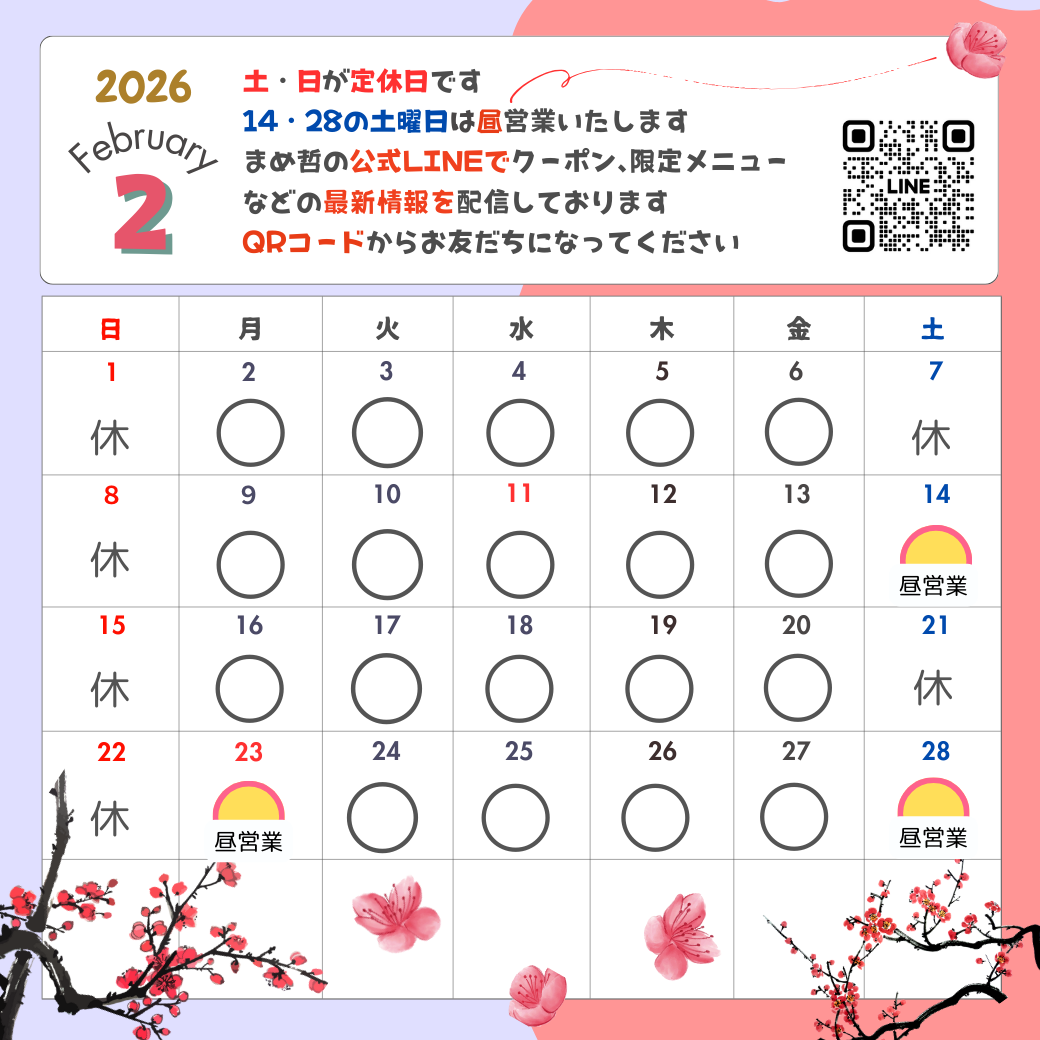 2月の営業カレンダーをUPいたしました |
